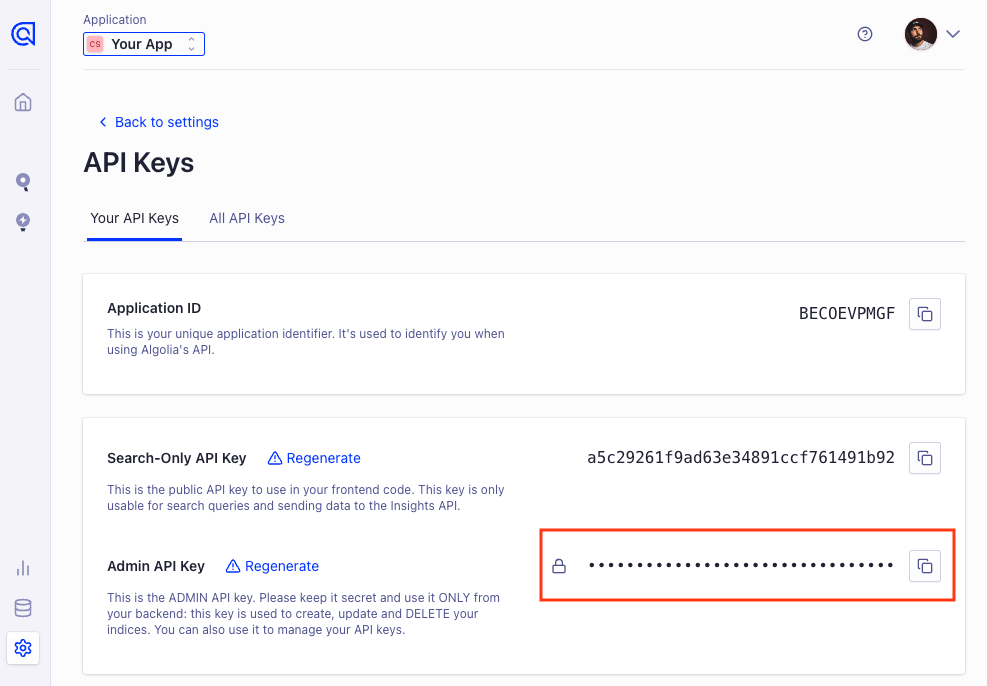 2. Admin API Key - A key that grants full access to all your application’s indices and configurations.