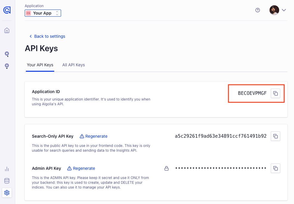 1. After picking your Application ID, scroll down and copy Admin API Key