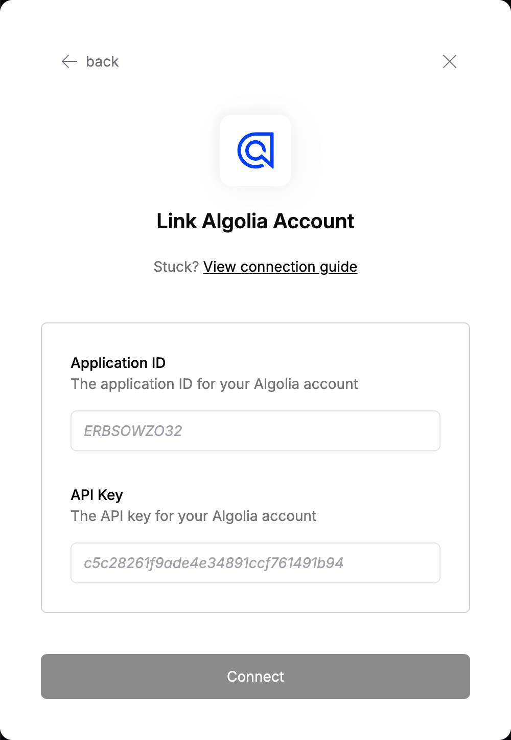 You can use your Search-Only API Key if you only want to replicate records, but it won’t let index anything to Algolia. You can also choose to generate a dedicated key.