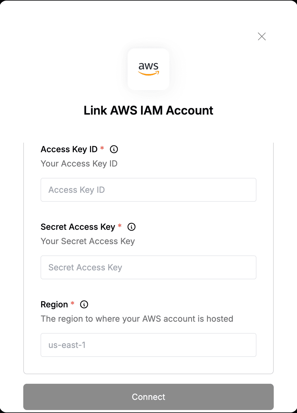 2. Enter the Access Key ID, Secret Access Key, and Region in their respective fields.