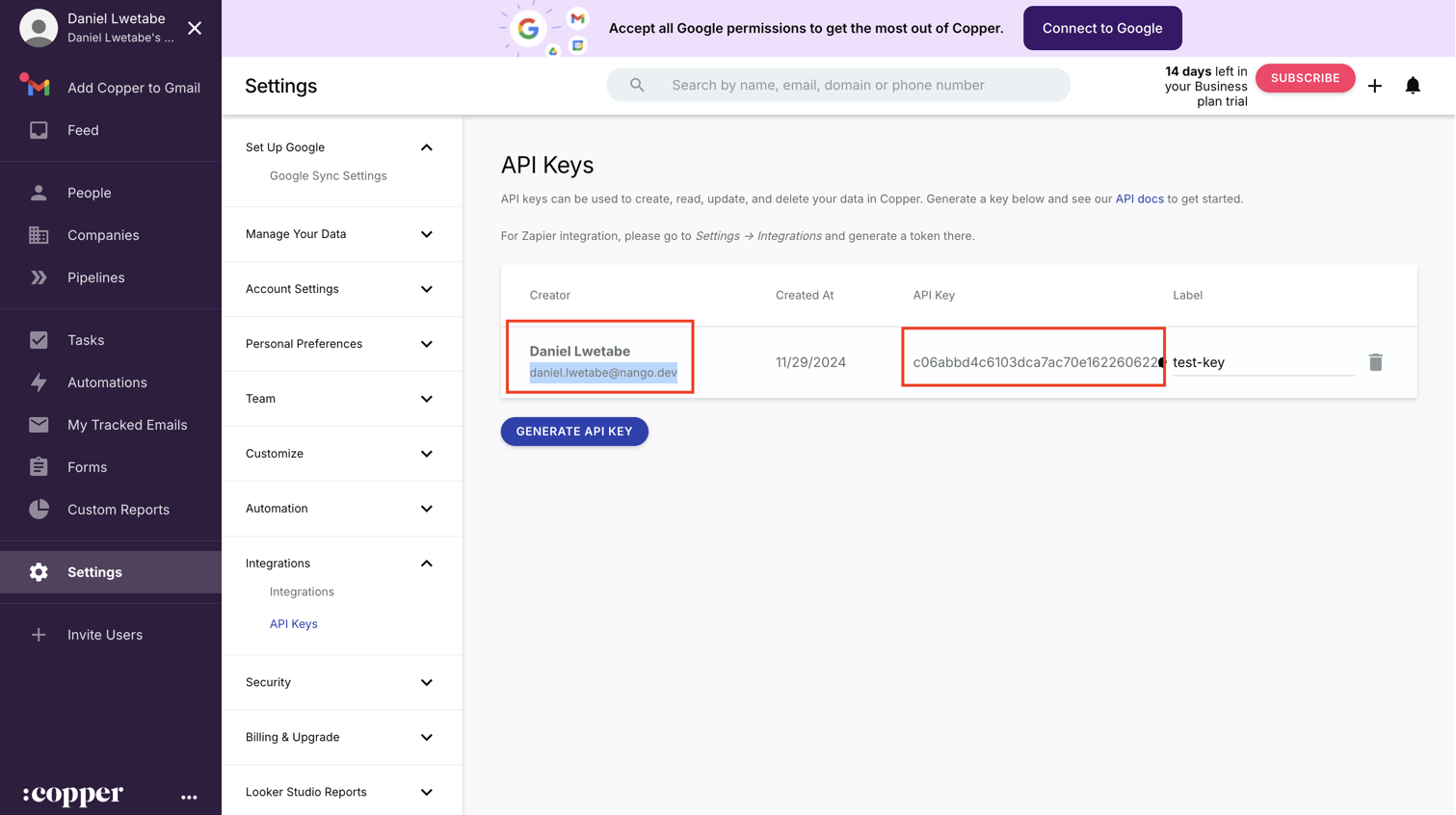 1. Log into your Copper account and navigate to System settings > Integrations > API Keys and click the GENERATE API KEY button.
