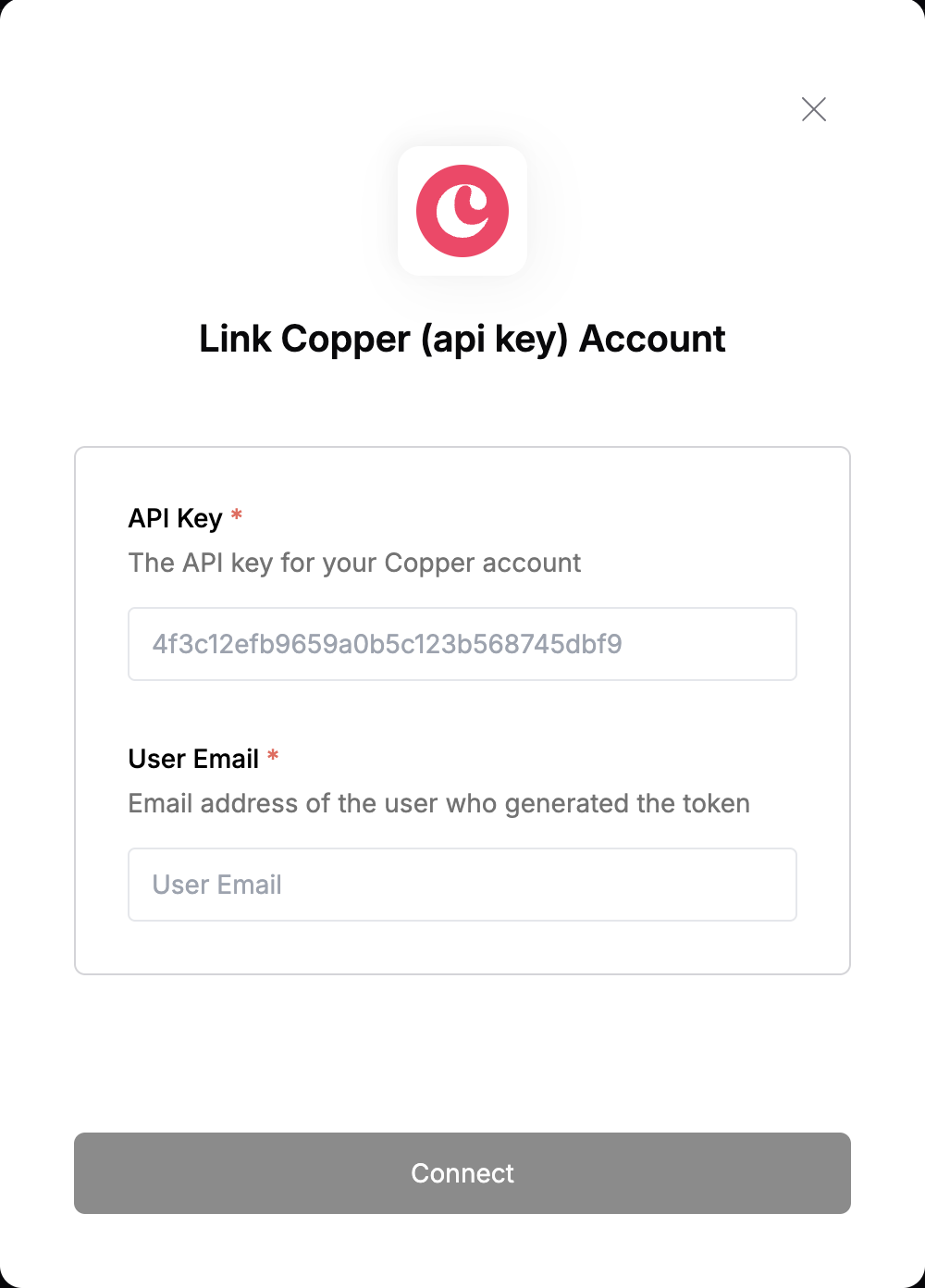 To authenticate using your API credentials, navigate to the Copper authentication form. Enter your credentials as follows: