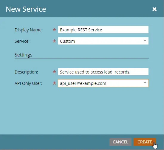 1. Navigate to LaunchPoint > New and New Service. Give your service a descriptive name and select Custom from the Service dropdown menu. Give it a description, then select your new user from the API Only User dropdown menu and click Create.