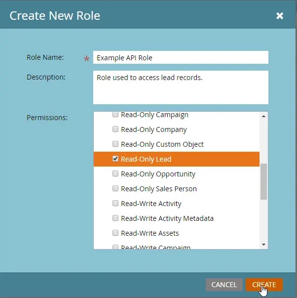 1. Create an API role (if not already created) and give it the Read-Only Lead permission with a descriptive name, then click Create.