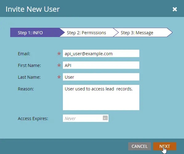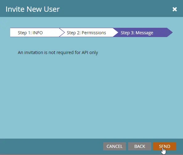 1. Go back to the Users tab and click Invite New User. Give your user a descriptive name that indicates it is an API user, and an email address, then click Next.
