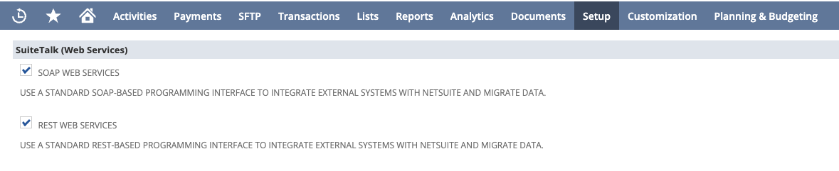 • Under the “SuiteTalk” header make sure the SOAP WEB SERVICES and REST WEB SERVICES checkboxes are checked