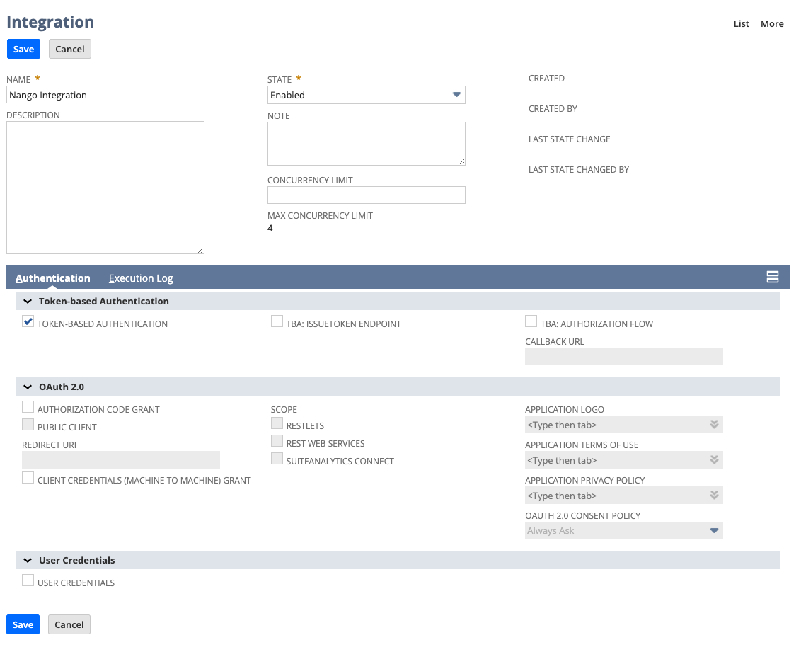• Enable TOKEN-BASED AUTHENTICATION and disable TBA: AUTHORIZATION FLOW and AUTHORIZATION CODE GRANT